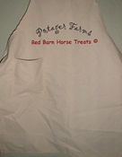 Natural color, 100% cotton, matching fabric neck strap and waist ties, patch pocket at waist level, reinforced at stress points, and 12" embroidery
